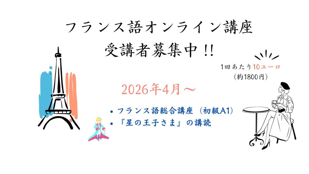 パリ在住30代日本人フランス語教師です。ソルボンヌ大学学士課程フランス現代文学を修了し、同大学修士課程でFLE(外国語としてのフランス語教授法)の資格を取得。翻訳実務検定TQE(仏和)合格。